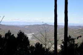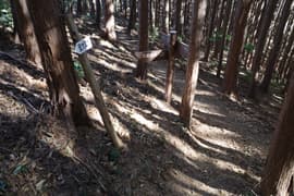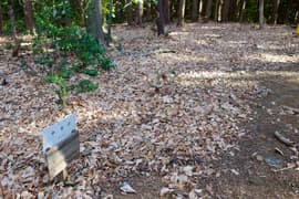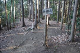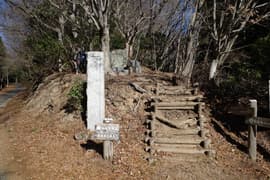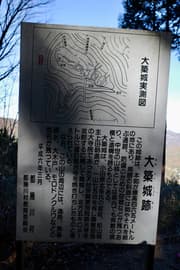 昼食後、小尾根を登って大築山に向かう。右にトラバースし、途中で分岐して急斜面を一直線に直登。稜線に出て左に登ると平坦な頂上に一角で、「大築城跡(おおづくじょうあと)」の説明板がある。それによると「大築城は、小田原北条氏の家臣、上田朝直(ともなお)が、一山七五坊を有し関東屈指の大寺院であった慈光院を攻略する際に、北方5kmに慈光院を望むこの山頂に築城し、その後、慈光院を焼き討ちした」とのこと。確かに西平辺りの集落の眺めが良く、慈光院も見えそうだが、それにしても焼き討ちのために、こんな山奥に城を築くとは、戦国武将はやることが恐ろしい。