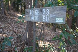 平坦な山頂を進み、新柵峠へ急坂を下る。坂の途中で「10座周回 33/50km」と記された標識を見る。「1050 peaky distance cumulative elevation 3,000M」という小さなシールも貼られている。50kmは日帰りは無理だろうな。10座がどこの山なのかは、少々気になる。