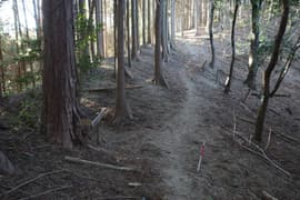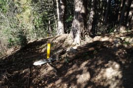 硯水のすぐ先で、ルートは尾根の鼻を回って左折。ここは右にも明瞭な道型があって、危うくそちらに行きかけたが、木の幹に巻かれたビニテに「→大築山→」と書かれているのに気が付き、事なきを得た。この分岐は迷い易いので要注意。