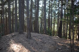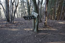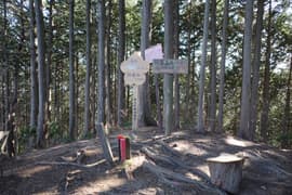 頂上は東西に長く平坦で、どこが最高地点か判然としない。西の端に倒れた道標と共に小さな山名標識があるのみ。引き返して、稜線伝いに隣りの小築山に向かう。南面の巻き道に合流し、小鞍部から軽い登りで小築山の頂上に着く。こちらの山頂も平坦で広く、樹林に囲まれて展望はなし。「小築山448m」の小さな標識があるのみである。
