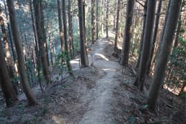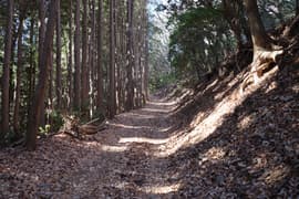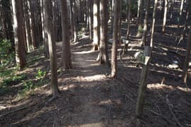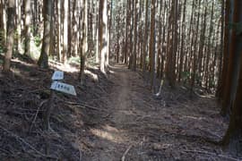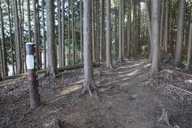 飯盛峠に戻り、大築山に向かって薄暗い植林帯の緩斜面の山道を下る。右手は先程登った飯盛山の北面で、かなり急な斜面だ。やがて車道(林道梅本線)に出るが、すぐ先で文字が掠れた道標に導かれて尾根上の山道に復帰する。