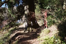 なだらかな尾根の左斜面をトラバースすると、南面が開けて日当たりの良い斜面があり、山道を半ば塞いで杉の巨木が聳え立つ。木の脇には赤鳥居と稲荷社がある。この木が越沢(こえざわ)稲荷の大スギだ。説明板によると幹周り6.05m、萩日吉神社(西平)の児持杉に次ぐ大きさで、地面に着くほど垂れ下がった枝に特徴がある、とのこと。