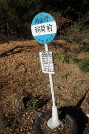 大スギの傍らには日溜まりがあり、ベンチもあるので、ここで一休み。仮面林道ライダーさんのサイトのトップページに写真が掲載されているバス停もある。ここに実物があったのかー。もちろん、会社名は架空で、バスは来ない。