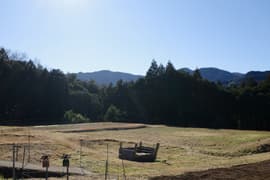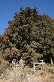 南斜面から大スギの全景の写真も撮ってみる。神社の鳥居と思しき木造物には○○農園と書いてあった。この大杉は見応えあり。山村風景も良くて、お勧め。後日調べると、すぐ近くにはくぬぎむら体験交流館をはじめ、いろいろ見所があるようである。