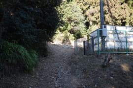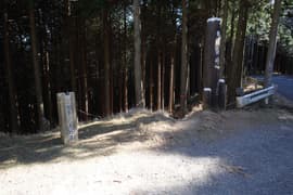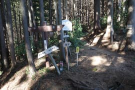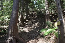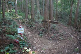 大スギのすぐ先で道は三方に分かれ、進路が少し分かり難い。ここは水道施設の角を右折。するとすぐに新旧の道標があり、「←⑤砥石のヒノキ 約2.1km」の道標にしたがって左折。幅広いが路面が荒れた未舗装車道(地形図上の軽車道)に入る。なお、ここを直進する道は「巨木の里・大野」に通じるようである。