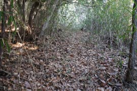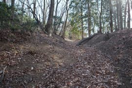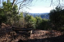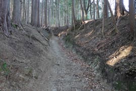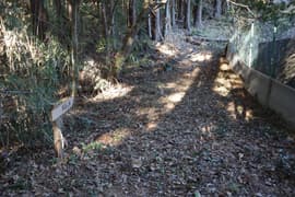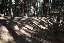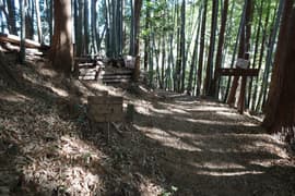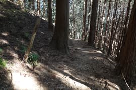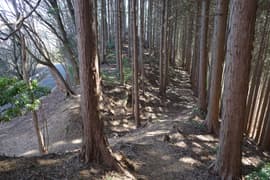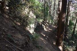 683m標高点を過ぎた辺りで、やはり文字が掠れて辛うじて「←城山(大築城?)」と読める道標に従って左折。傾斜が増し、少し下って右折。露岩が多く、ザレて滑り易い坂を下る。この辺り、概ね高原状の奥武蔵のイメージにはない険しさがちょっと感じられて、変化がある。左手は都幾川支流氷川の源流域で、奥山の雰囲気。今日、登った丸山のゆったりとした稜線も眺められる。小さな岩場を下ると、左に林道経由で飯盛峠に上がる山道を分ける。急坂が終わり、広く平坦な植林帯に入ると「馬場」の標識がある。