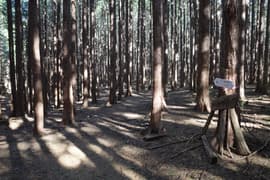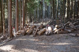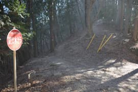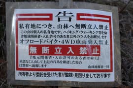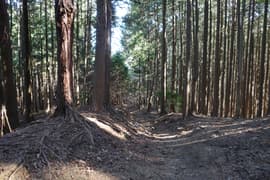 軽車道は尾根の左斜面を絡んで、杉林の中を緩く登って行く。深く抉れて、岩盤が露出した区間が続く。途中でまた「10座周回 31/50km」の標識を見る。風早山(667m三角点峰)の急な北西斜面をトラバースし、再び尾根の直下まで上がる。伐採した丸太を積み上げて通せんぼされており、「無断立入禁止」のプレートが掲示されている。私有地につき、オフロードバイク・4WD車両は乗入禁止だが、ハイキング・ウォーキングはOKのようである。「←⑤砥石のヒノキ 約0.7km」の道標もあり、次の巨木まであと少しである。