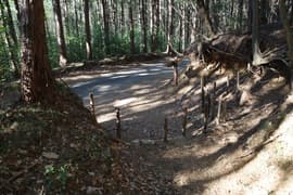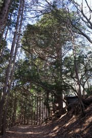 乗合タクシーの宮尾根バス停を過ぎ、杉林の山腹をカーブして下ると、右に「大カヤ入口」の道標があり、幅広い石段道が分岐する。「巨木大カヤ(埼玉県指定文化財)この先約180メートル」とのプレートがあり、その距離ならば近いので、行ってみることにする。