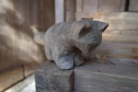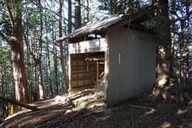 このヒノキは、周囲の植林から抜きん出て高い。2本のヒノキの間に注連縄が張られ、砥石山の神の小社がある。祭壇には何故か木彫りの子猫が置かれ、下の物をジッと窺う姿勢をとっている。かわいい。