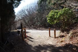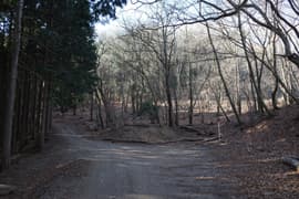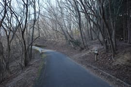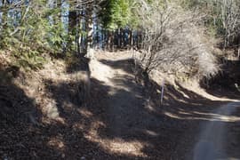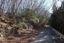 道はやがて尾根から左に外れて、丸山の東斜面を横切って行く。尾根を直登する道はないが、冬枯れの雑木林の緩斜面なので、丸山にショートカットして行けそうと思ったが、今日は風当たりが強くて寒いので、直登は止めておく。平坦な未舗装道を辿ると檥峠に到着し、奥武蔵グリーンライン(以下、奥武蔵GL)に合流する。今日は寒過ぎて観光日和ではないせいか、車の通行は全くない。