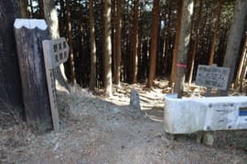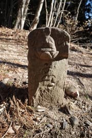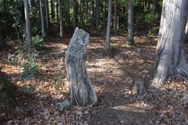 檥峠から丸山を往復する。登り口には「山毛欅峠 波郷の碑」の石柱、登り始めてすぐの所に「万緑を顧みるべし山毛欅峠 波郷」と刻まれた石碑が建つ。後日検索すると、石田波郷(はきょう)という俳人の句碑らしい。私としては、句碑の前にある仏が浮き彫りされた石標が気になる。風化して文字は読み取り難いが、これも後日調べると、神山弘著『ものがたり奥武蔵』にスケッチがあり、子の権現や高山不動への道を示しているらしい。