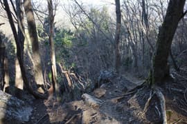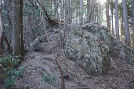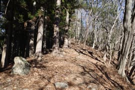 大岩や崖を交えた急斜面をトラバースすると猿岩峠に着く。左に椚平、右に麦原への峠道を分け、尾根を直進する。このまま大築山まで行くつもりだったが、「もろどの廓」への道標を見かけて気が変わる。そろそろ昼時で腹が減ったが、頂上は風が強くて寒く、休憩どころではないだろう。南面のもろどの廓ならば風が避けられて、寒さは凌げるかも。