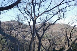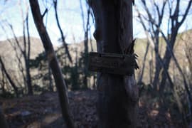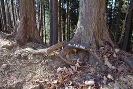 檥峠に戻ると4、5台の車が来ていて、多数のハンターが集結している(狩猟期間は11/15〜3/15)。峠の一角に「←大仁田山」の道標を見つけ、それに従って稜線を辿る。約3分で頂上着。小さな山名標識がある。展望は木の間越しに武甲山が見える程度。小さいピーク過ぎて、何故、山名が付いているのか、由来が気になるレベルだ。