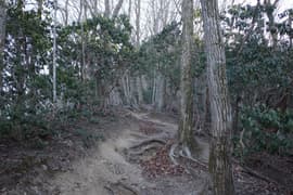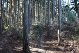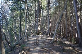 現役の作業道らしく路面が平らになり、簡易舗装された区間もある。尾根を越えて吹き抜けていく北風が強烈に冷たい。低山とはいえ、平地とは寒さが段違いだ。植林の下生えにアセビの林が現れ、植生も変わってきた。直線的な車道歩きが続いて、ちょっと飽きて来た頃、ようやく砥石のヒノキが現れる。