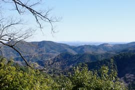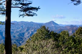 植林に囲まれた狭い山頂には「越生10名山 飯盛山795m」や「飯盛山(龍ヶ谷富士)越生町最高峰795.2m」といった山名標識があり、地元が一押ししている山らしい。手軽な山だが、今日、ここまで登頂した山の中では、一番、山頂の雰囲気が良い。西面を少し下ると木立が薄く、武甲山から奥多摩にかけての山並みが眺められる。また、富士山の展望写真も掲示されていて、その方向に目を凝らすと確かに富士山の真っ白な頂が見える。辰年の登り初めで龍の字が付く山に登れたし、富士山も拝めたしで、めでたし、めでたし。