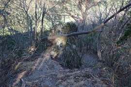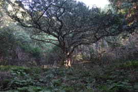 往路を戻り、大カヤ分岐に近づくと、右手の斜面に大カヤが見えて来た。やはり往路で大カヤ分岐は左が正解だった。石碑の文によると推定樹齢千年、幹の周囲6.6m、張り出した枝の差し渡しは25mとのこと。曲がりくねって広がる枝振りが妖しく尋常でない雰囲気を醸し出す。リアルなトレント(架空の樹木型の怪物)。実に見事で感動。これは寄り道した甲斐が大いにあった。