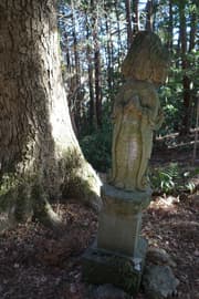 やがて竹林に入り、「←大附」の道標に従って左折。直進する道は大楠・山入に至る。ここはもう人里の雰囲気が漂う。竹林を抜け、緩く下ると石仏のある分岐に着く。ここが広見越のようだ。石仏は三面の馬頭観音で、かなり風化が進んでいる。左の顔は口が開いた阿、右は口が閉じた吽となり、中央の顔は無表情。メデューサのような髪型が異形だ。ここから緩く下ること僅かで、車道に出る。