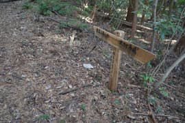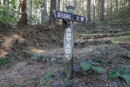 石段道を登るとY字の分岐があり、「大カヤ分岐」の道標が建つ。左の道は「←落合峠0.9km・女鹿岩登山口2.2km」の古い道標が指し示している。「巨木大カヤ この先→」のプレートがあるから、大カヤは右の道かな?