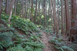 あとは杉林に覆われた広くなだらかな尾根をゆるゆると下る道が続く。尾根の右斜面をトラバースする箇所は、下生えにシダ類が繁茂して緑が綺麗だ。再び、右へ麦原への道を分け、「大附・西平→」の道標に従って直進する山道を辿る。