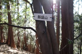 南入口から急坂を登る。笹藪が少し被さるが、石段が半分埋もれていて、かつては良く歩かれた登山道だったようだ。大した標高差ではないが、6時間以上歩いて来たあとなのでさすがに足が重い。頂上は広く平坦で、樹林に覆われて眺めはなく、ゴルフ場が垣間見える程度。北端に廃神社と倒れた木の鳥居、木の幹に架けられた「飯盛山」の小さな山名標識がある。それにしても、一日に同名の山3座に登るとは、稀なケースではなかろうか😅