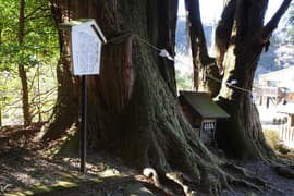 車道に戻って下ると、山麓に下り着いたところに萩日吉神社がある。杉の巨木の神社林に囲まれているが、中でも神社入口にある児持杉は大きくて見事だ。男杉と女杉があり、それぞれ根回りが6.47mと8.89m。樹高は約40m、樹齢は約800年とのこと。太さは今日訪れた巨木の中でも群を抜いていて、しかも2本。これも見応えがある。この木に祈念すると子宝に恵まれると言い伝えられているそうである。
