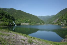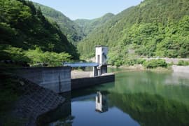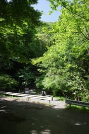 さわらびの湯から歩き出し、車道を上って、有間ダムに向かう。有馬ダムはロックフィルダムで、後日調べると堤高83.5m。ダムの天端を渡る。ダム湖(名栗湖)の周囲の山々は瑞々しい緑に包まれ、湖面の奥には有間山稜を望む。これは良い眺めだ。バイクのツーリングで来て、休憩中のおじさんライダーが多い。
