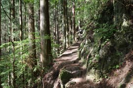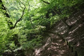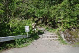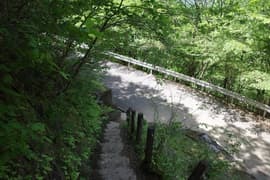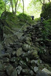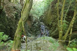 第二のゴルジュは狭くてちょっと長く、段々に落ちる流水の際を登る。小滝があり、ゴルジュはその奥へ、さらに狭まって続くが、登山道はここで巻道に入り、左岸を石段と手摺の鎖で急登する。登山道としては結構険しい道で、これはこれで変化に富んでいて面白い。振り返ると、ゴルジュの中に後続のハイカーさんが大勢居られるのが見おろされる。