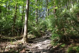 ゴルジュの出口には白孔雀ノ滝がある。見おろすと、一枚岩を一筋の水流が流れ落ちる綺麗な滝だ。登山道は巻き道から落口で沢身に戻る。これで白谷沢コースの核心部は終わり。谷はなだらかになり、杉植林が現れる。沢沿いの登山道を辿り、短い急坂を木の階段道で登ると大名栗林道に出る。ベンチがあり、ハイカーさんが休憩中だが、先に進もう。