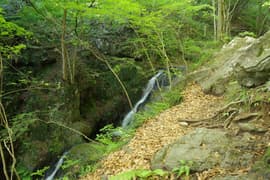 登山道は、やがて左岸の山腹の高い所をトラバースする道となる。段々、谷が狭まり、険しさが出てくる。小さな岩場を越え、渓流に近づくと二段の小滝があり、その落口近くで沢に降りる。落口には「藤懸の滝」の標柱が建つ。