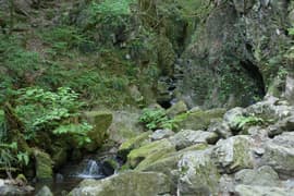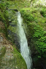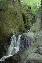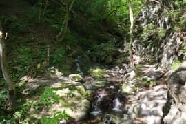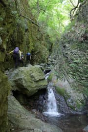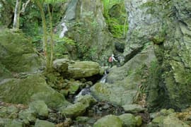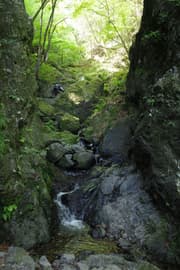 ゴルジュの中はU字に穿たれた岩盤で、水際を登る。ゴルジュは短くて、すぐに通り抜けるが、その先の沢は傾斜を強めて綺麗な小滝をかける。これが天狗ノ滝らしい。苔むした転石に覆われた沢を進むと、第二のゴルジュの入口に着く。