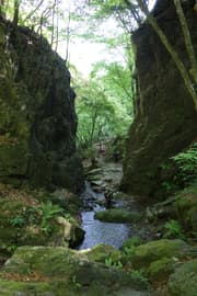 登山道はここから沢沿いの道となり、大きな転石の多い沢を何度も渡り返して遡る。これは楽しい。流水際の岩の上で咲いている黄色い花はヒメレンゲかな。少し登ると、両岸とも岩壁で門のように切り立ったゴルジュの入口に着く。わくわく。