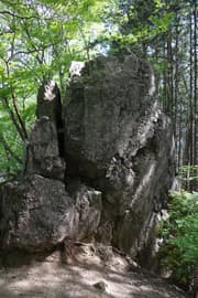 登山道はザレた急斜面をジグザグを切って急登したのち、新緑の雑木林に覆われた山腹のトラバース道となる。尾根に出た所にベンチと大きな石塔がある。この尾根が滝ノ平尾根で、石塔は岩茸石と呼ぶ。今日はここから棒ノ嶺を往復し、帰りは滝ノ平尾根を下ってさわらびの湯に戻る予定である。
