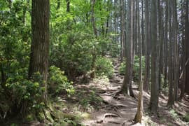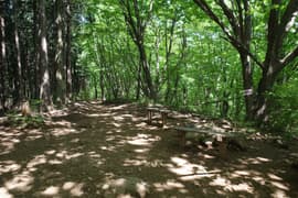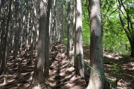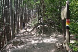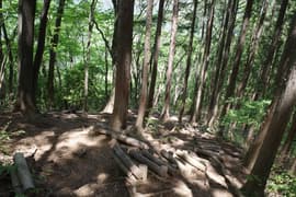岩茸石から尾根道を登る。左斜面は檜植林、右斜面は新緑の雑木林で、その境を緩く登る。やがて急坂となり、丸太の階段道が現れるが、壊れて危険なので利用不可の掲示がある。急登すると都県境稜線に登り着き、小広い平地に権次入(ごんじり)峠の標識と簡易なベンチがある。峠といっても鞍部ではなく、尾根の肩となっている。