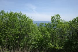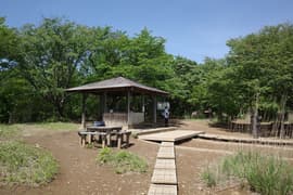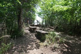 権次入峠から棒ノ嶺へは同じような雰囲気の尾根道を登って、15分程の短い距離だ。登り着いた頂上は広くなだらかで、多分、泥濘化を防ぐためだろう、木道が敷設されている。休憩舎やベンチがあり、大勢のハイカーさんが休憩中。頂上の中央には桜の木が大きく枝を広げて葉を繁らせている。樹林に囲まれて、展望はほとんどない。かつては北面に展望が開けていたようで、展望説明板には武甲山や伊豆ヶ岳、谷川岳や日光白根山まで記載されているが、今日は薄靄がかかって遠方の山は見えないし、手前の樹林が育って視界を遮り、奥武蔵の稜線の一部が見えるだけ。展望は期待していたので、ちょっとがっかり。