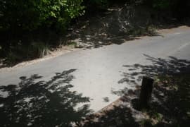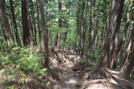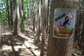 尾根道はこの先で再び林道を横断し、木の階段道を下って三回目の林道横断となる。木の根が張り出した急坂の下りが続く。埼玉県警察山岳救助隊が自作したと思われる「転倒注意」の掲示が頻繁に現れる。実は私も一度尻餅をついた。左手を変に付いて、親指の付け根の母指球に血豆が出来て痛い😭。まあ、それくらいで大事に至らず良かった。