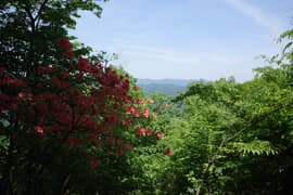 岩茸石からさらに滝ノ平尾根を下る。なだらかな尾根で、アセビの木が多い。林道を横断し、少し登る。一株だけだが、満開のヤマツツジを見る。数基のベンチがある平坦なピークに登り着く。古いハイキングコース案内看板があり、それによるとこのピークは白地(しきじ)平と呼ぶらしい。展望櫓もあり、奥多摩側の眺めが良さそうだが、老朽化のため周囲は立入禁止となっている。残念。その代わり、奥武蔵側の展望が得られ、名栗湖北岸の金比羅山、その向こうに二子山や伊豆ヶ岳、一番奥には奥武蔵の主稜線が長々と横たわる。今日一番の展望が得られて、ちょっと嬉しい。