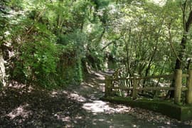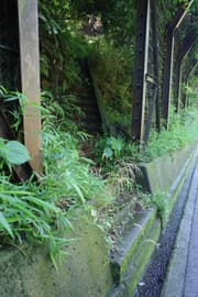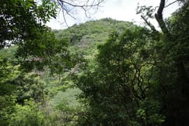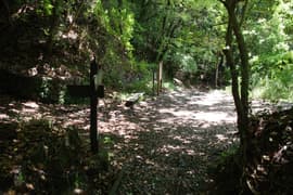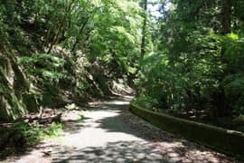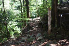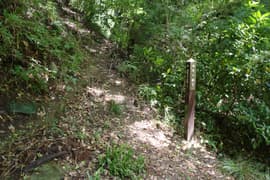 この車道は落石や強風で落ちた枝葉が路面に散乱し、車の通りは稀な様子。右側の渓流(再度東谷)は雨上がりということもあって水量が多く、涼を感じる。途中、高雄山(476m)への登山道を分ける。高雄山にも興味を惹かれるが、結構な登りがあり、ちょいと立ち寄るという訳には行かないようなので通過。