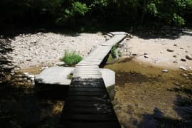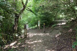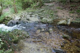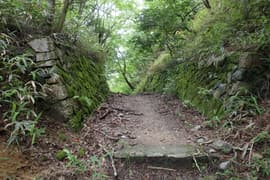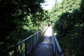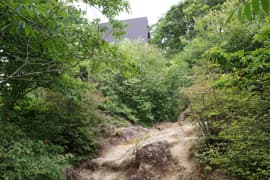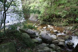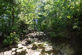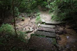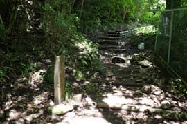 峠から南面に下る道は幅広く、急な箇所には石段があって歩き易い。谷へ下ると水流が現れ、飛び石ならぬブロック伝いで何度か流れを渡る。山腹をトラバースする箇所には柵が設置され、良く整備されている。大きな砂防堰堤の横を通過し、その下流で右岸から左岸に渡る。ここは不安定な飛び石伝いの渡渉となり、雨後で水量が多めなこともあって、ちょっと注意を要する。