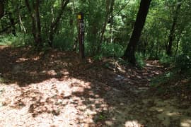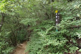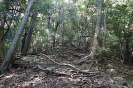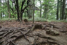 鞍部から登り返して稲妻坂に取り付く。名の通り、急斜面をジグザグに登る坂で、なかなかきつい。これを登り切ると右に学校林道への道を分ける。