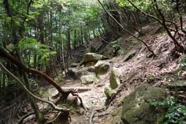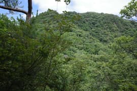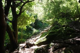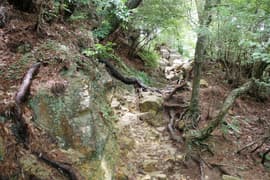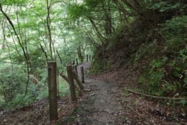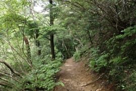 ここから摩耶山に向かう。しばらく生田川の渓流に沿って進む。道沿いには市民山岳会の山荘が何軒かあり、この辺りまでは車も進入可。神戸市街から程近い場所だが、山深い雰囲気がある。「天狗道」の石標で右折し、山腹を登り始める。右手の緑濃い山の上には布引ハーブ園と思しき建物の屋根が見える。