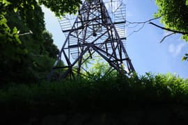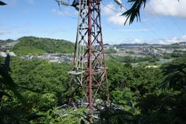 左に地蔵谷・アドベンチャールートを分けると摩耶山への最後の登りとなり、やがて石段が現れる。登り着いたピークには電波塔が建ち、反対側の尾根から車道が通じている。