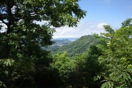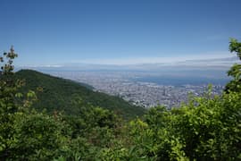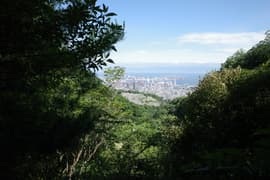 摩耶山への登りは岩場を交えた急登となる。相変わらず展望のない登りが続く。電波反射板のあるピークを過ぎると登りが一段落。少し下ったところに見晴らしの良い岩場があり、神戸市街を俯瞰する。足元の谷が意外と深く険しい。大都会に接して、よくもまあこんなに険しい山地があるな、と思う。