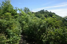 しばらく尾根を絡んで小さな上下のある道となり、一息つける。再び、行く手に高い尾根を望む。たぶん、あの天辺が摩耶山の頂上の一角だろう。