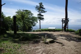樹高が低くなって日当たりの良い尾根道を緩く登ると鍋蓋山の頂上に着く。頂上は広い平地となり、中央に三角点標石がある。南面が大きく開け、神戸市街や大阪湾、遠く淡路島や和歌山の山並みが見渡せる。これは素晴らしい展望だ。「鍋割山展望所」の標識があり、ベンチや眺望説明板が設置されている。南面の一段下にも広場があり、多数のベンチが置かれ、今日は平日なので他に誰もいないが、大勢のハイカーが憩える山頂となっている。