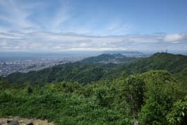 東に延びる六甲山地の山並みも眺められる。ここまでのアップダウンの多い縦走路と比較して、この先は高原のような平坦な稜線が連なり、見えている範囲は楽そうに見える。距離は長いが、全山縦走路の残り区間は一気に行けるかな。自販機で冷たいジュースを買って飲み、一休みしたのちリスタートする。