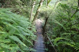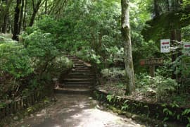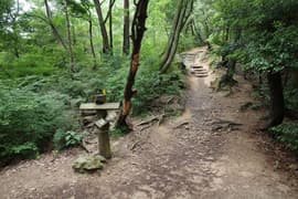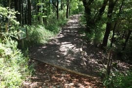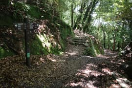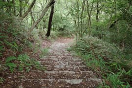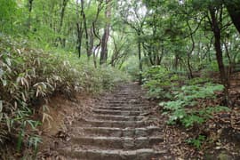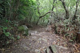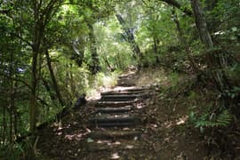 左に黒岩尾根・トエンティクロス方面への山道を分けると、いよいよ摩耶山への長い登りに取り付く。木の階段道を急登。傾斜が緩むと右に布引ハーブ園への道を分ける。少し下りにかかると、行く手の尾根が高く盛り上がって見える。この登りが稲妻坂だ。