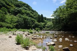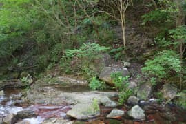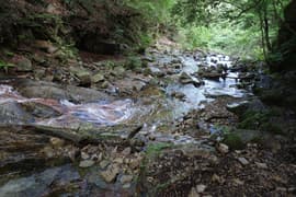 やがて車道終点となる。右手に沢を渡ってトンネル入口があるが、そちらは進入禁止。終点から山道に入ると、再度東谷と生田川の出合に着く。出合には河原が広がって開放的。焚き火の跡があるところを見るとキャンプする人も居るようだ。ここが市ヶ原らしい。気持ち良い場所で、休憩中のハイカーさんも居られる。