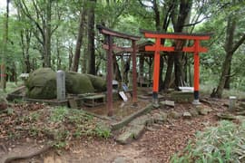 電波塔の脇を通り、駐車スペースから右手の高みに通じる踏み跡を登ると、鬱蒼と茂る樹林の中に赤鳥居が建ち、数個の巨石の塊や「天狗岩大神」の石碑がある。「天狗岩」の説明板もあり、次のように記されている。