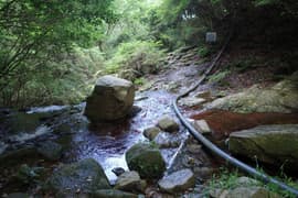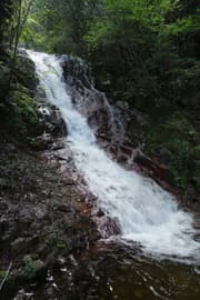 この先も数箇所、沢を渡る箇所がある。小滝の落口を渡る箇所もあり、ここを渡るには太い導水配管を利用せざるを得ない。下って、この小滝を見上げると、赤い岩盤の上を水が滑り落ちて、なかなかの美瀑である。