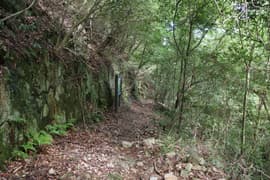 この先も砂防堰堤と渡渉が連続する。一般的なハイキングコースよりは難度が高く、面白い。崖を開削した道となり、その途中に案内看板がある。それによると、この道(杣谷道)は徳川道とも呼ばれ、江戸時代末期に外国人とのトラブルを避けるため、海沿いの主要幹線である西国街道を迂回するバイバスとして、幕府の命によって作られたが、利用されないまま開国を迎えて廃道になった。しかし、大正時代からハイカーに歩かれて徳川道と呼ばれるようになった、とのこと。いやー、街道の迂回路にしては険し過ぎ。